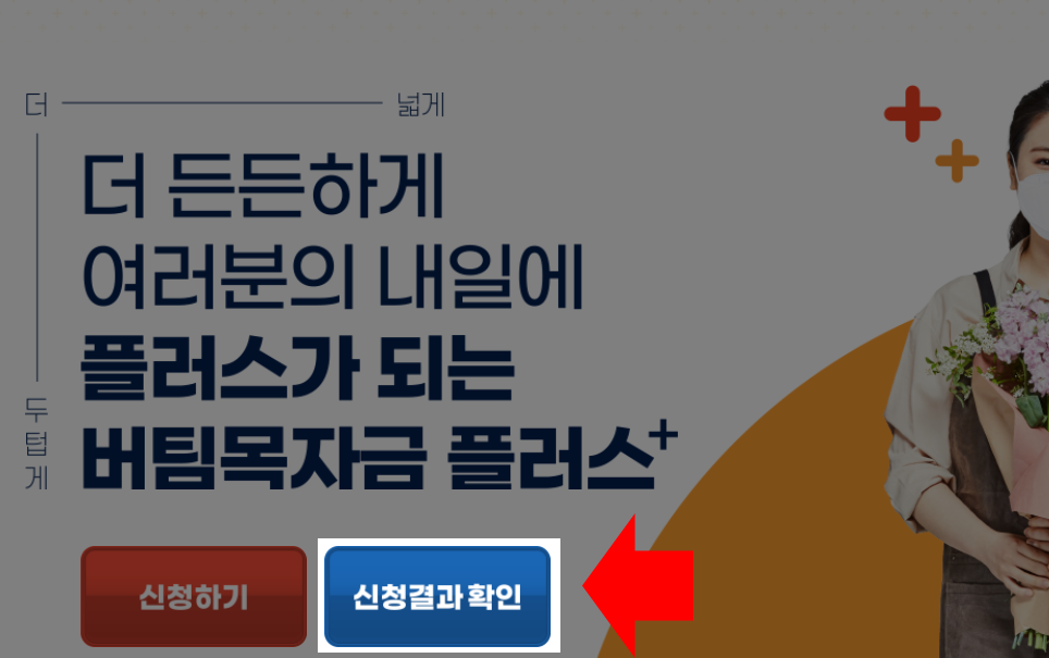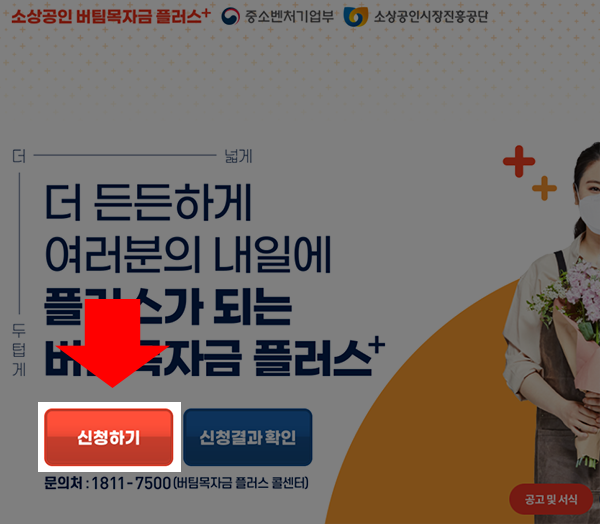 2) 소상공인 버팀목자금 플러스 홈페이지에서 좌측에 있는 신청하기 버튼을 클릭 합니다.