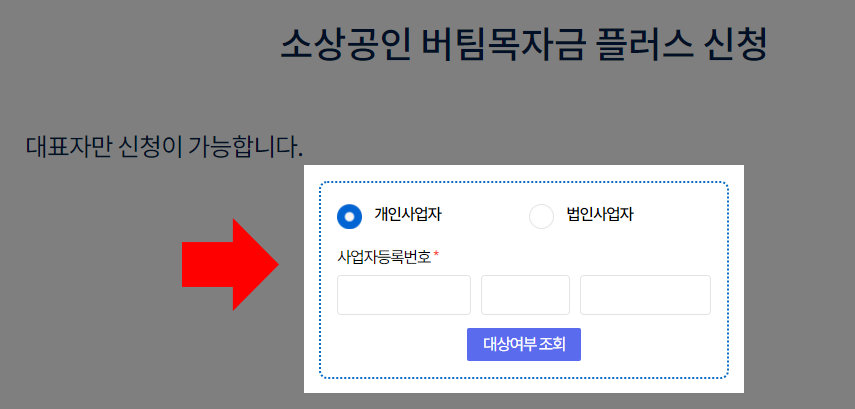 5) 개인정보 동의 후 사업자등록번호를 입력한 후 대상여부조회 버튼을 클릭하여 신청이 가능한지 먼저 확인 합니다.