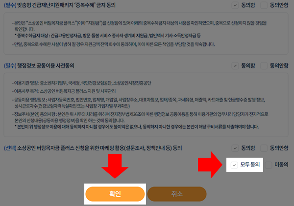 4) 소상공인 버팀목자금 플러스 신청 관련 개인정보 동의 등의 내용이 나오게 됩니다. 확인하신 후에 모두 동의를 선택한 후 확인 버튼을 클릭합니다.