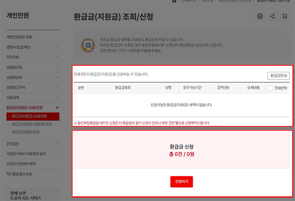 4) 미지급된 환급금이 있는지 확인 할 수 있는 페이지 입니다. 저 같은 경우 환급금이 없기 때문에 해당 내역이 없는것으로 확인 되었습니다. 그 밑에는 환급금 건수와 신청 할 수 있는 금액이 표시되어 있으며 버튼을 클릭하여 신청하실 수 있습니다.