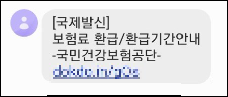 문자에는 국민건강보험 보험료 환급에 대한 내용을 담고 있습니다. 궁금증을 자아내는 내용으로 문자와 함께 포함된 인터넷 주소(URL)을 클릭하게 끔 유도하는데요, 이를 스미싱 문자라고 합니다.