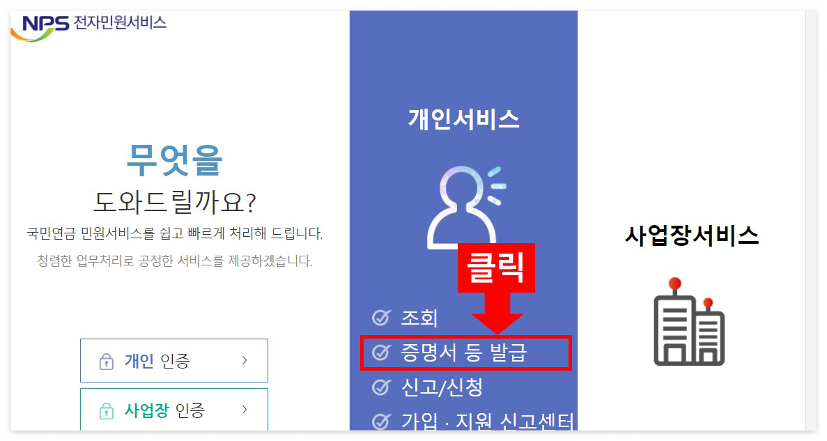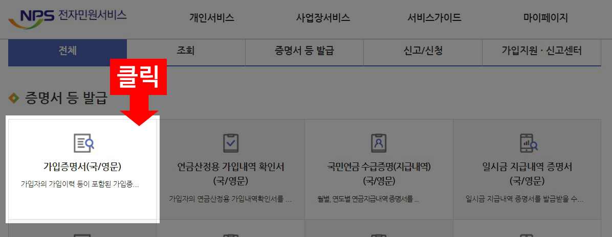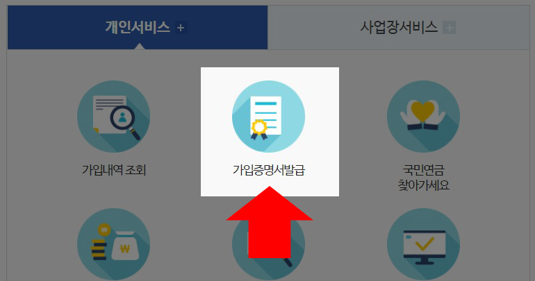 ③ 개인서비스에서 '가입증명서 발급' 버튼을 클릭 합니다.